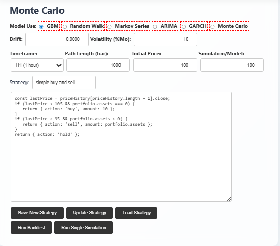 const lastPrice = priceHistory[priceHistory.length - 1].close; if (lastPrice > 105 && portfolio.assets == 0) { return { action: 'buy', amount: 1 }; } if (lastPrice < 95 && portfolio.assets > 0) { return { action: 'sell', amount: portfolio.assets }; } return { action: 'hold' }; - Jalankan Backtest / Simulation